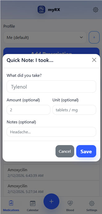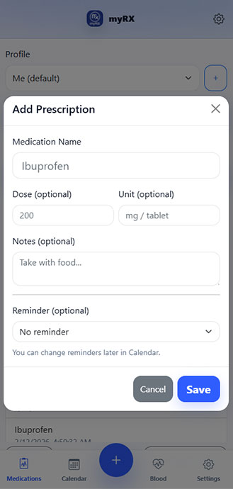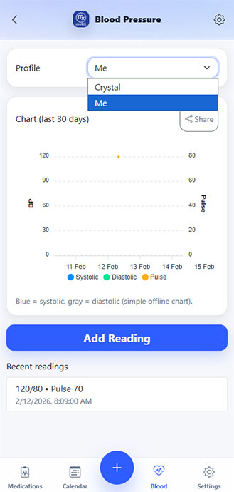 Install myRX, create a profile, add your medications and appointments, and you’re set. When you need it, export a clean summary or a blood pressure report to share with your doctor.
