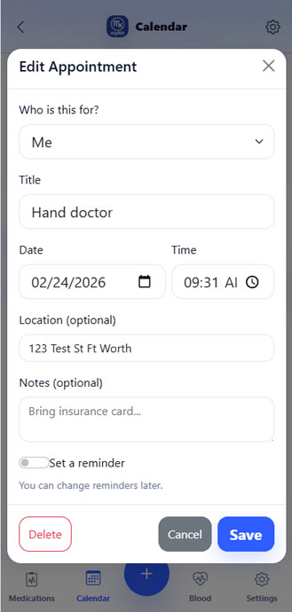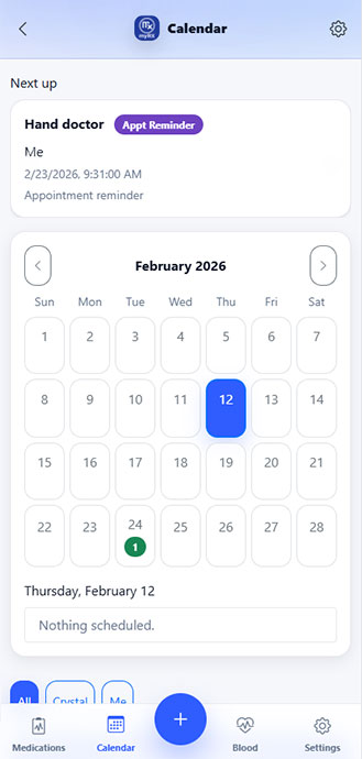 Save upcoming appointments with date/time, location, and notes. myRX helps you stay prepared and keep everything in one place.