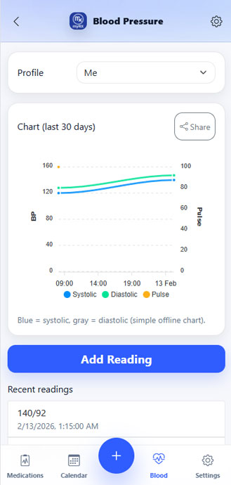 A simple, offline-first health organizer that stays on your device. Track prescriptions, log “I took it”, manage appointments, record blood pressure, and share a clean report with your doctor.