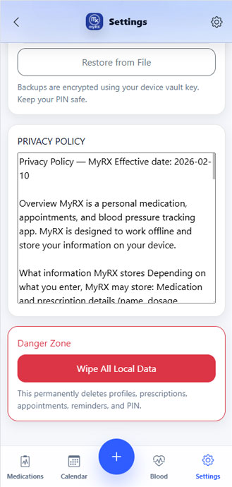 No account is required. myRX is offline-first and stores your entries locally on your device. There is no server for your health data. Sharing and export only happen when you choose to share.